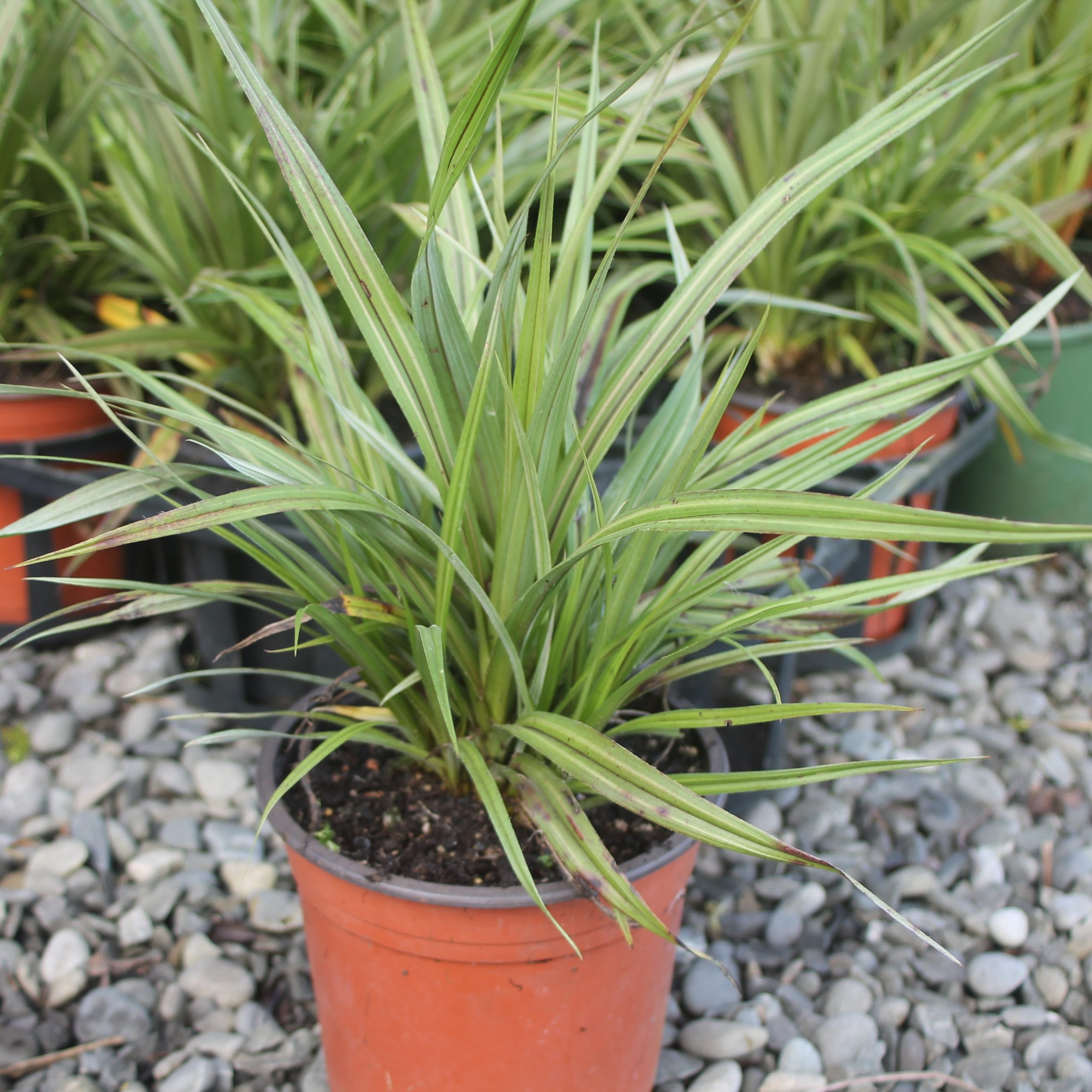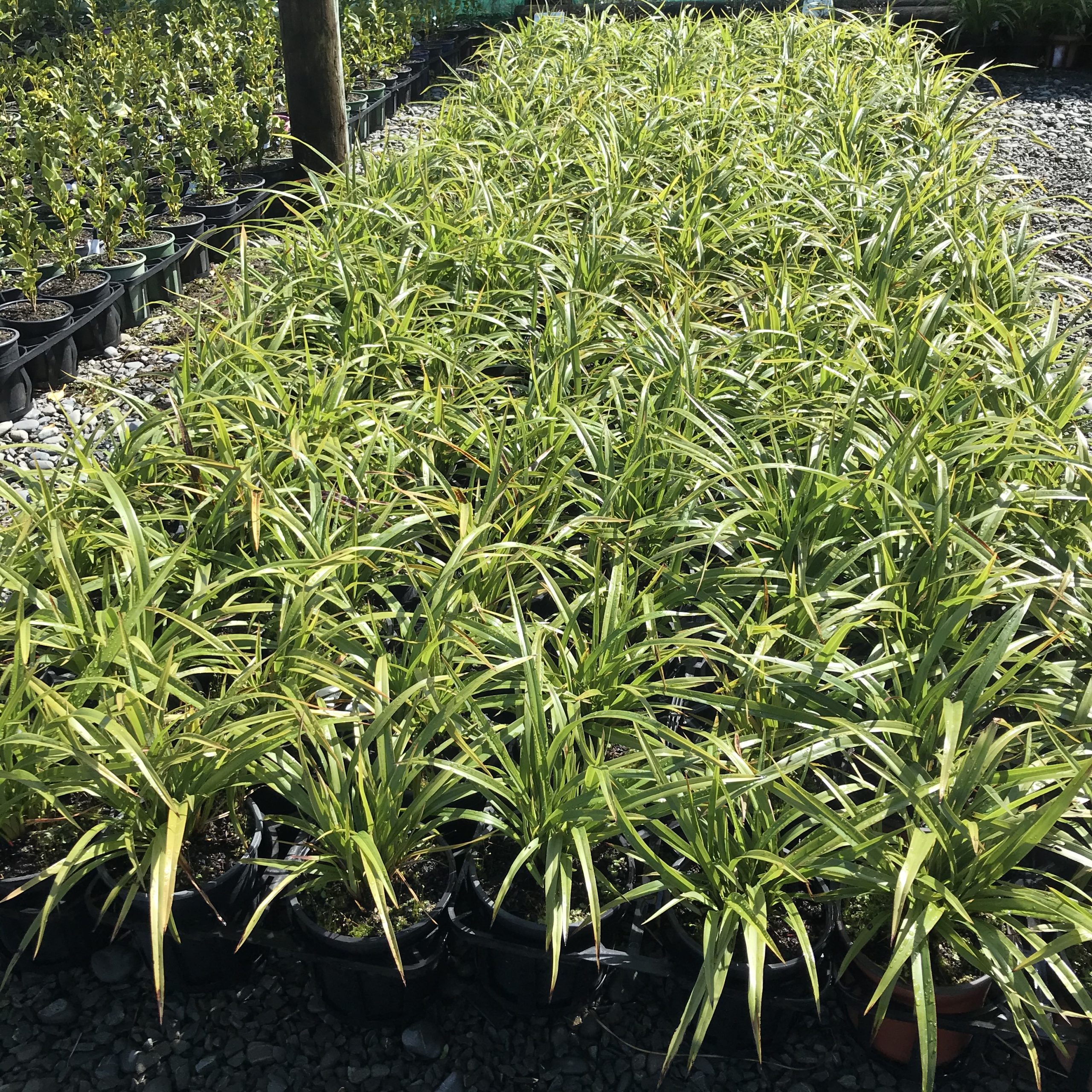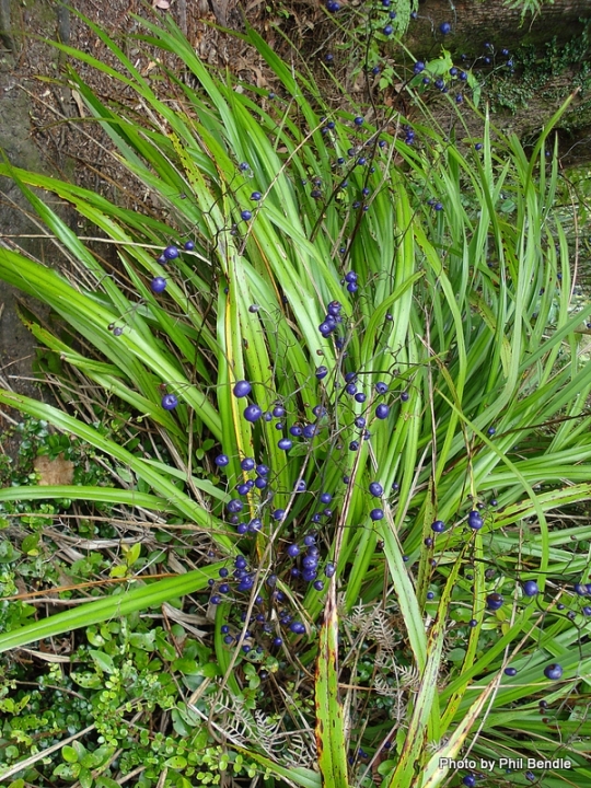 Dianella nigra is a clump forming flax-like perennial plant with vivid purple berries after small white flowers. Sun/semi shade in a range of soil conditions.