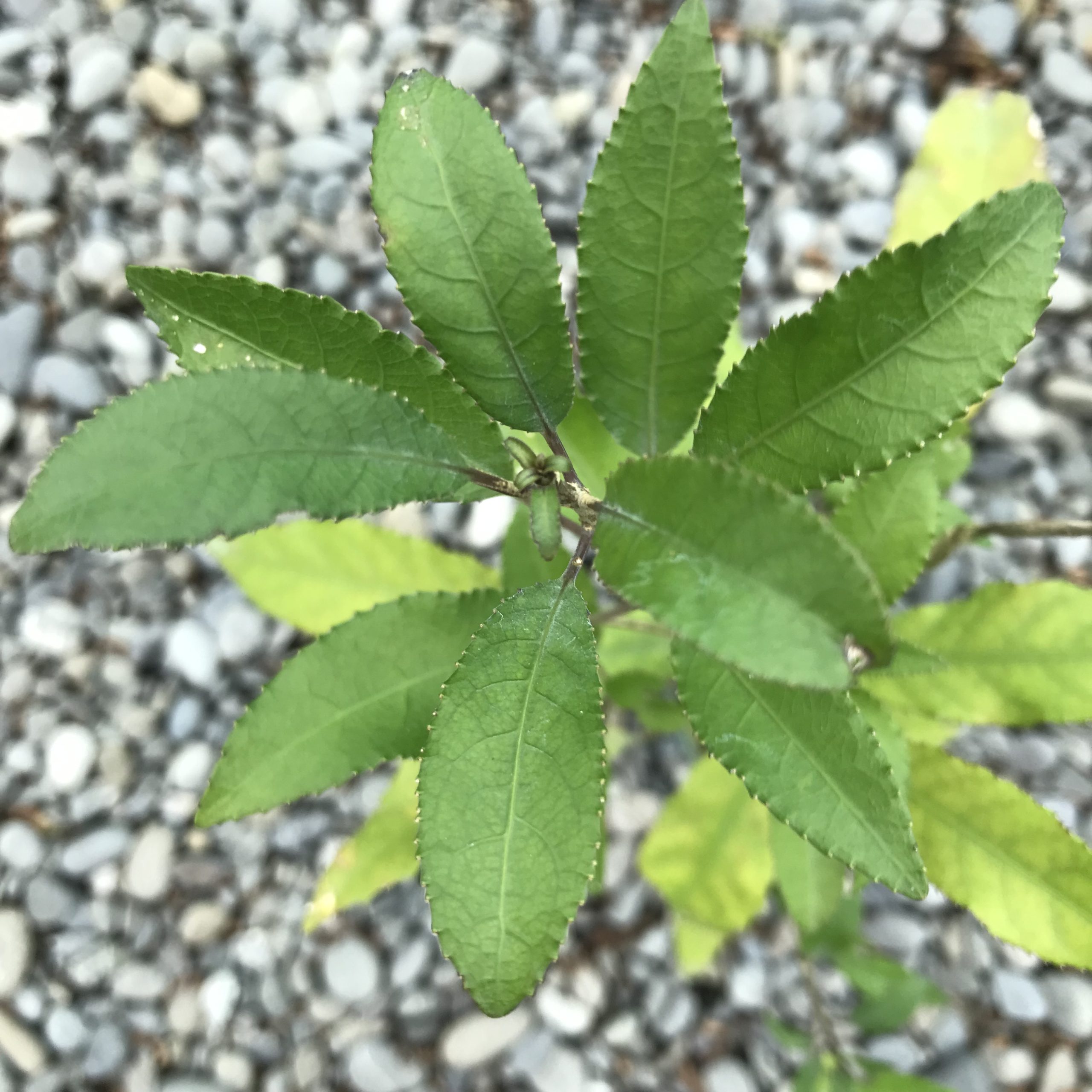 Melicytus ramiflorus is also called Māhoe or Whiteywood. It grows up to 10 metres high with a trunk up to 60 cm in diameter, it has smooth, whitish bark and brittle twigs. The leaves are yellow to dark green and serrated. Small flowers have a strong, pleasant fragrance. The berries are a striking violet colour when ripe. Flowering occurs in late spring and on into summer while the berries appear later on in summer to autumn.