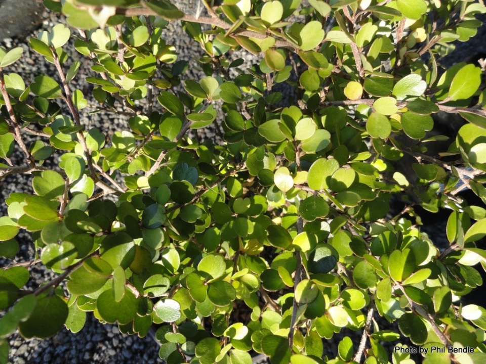 Striking, upright, divaricating shrub / small tree with weeping habit. Small leathery leaves, tiny flowers in clusters. Small berries, birds. Hardy