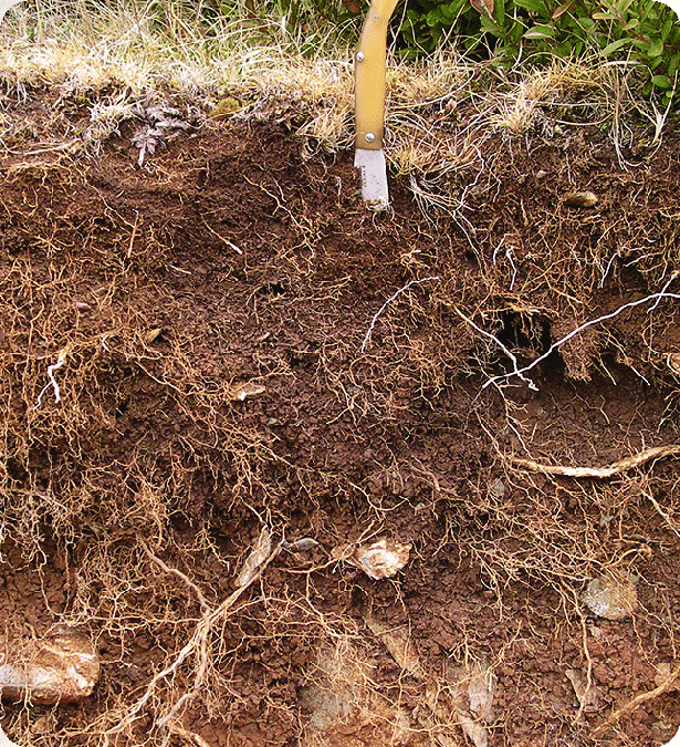 A steep bank showing the finest roots containing the soil, and the more stony subsurface layer, where there are thicker roots. Photo: Pere Casals.